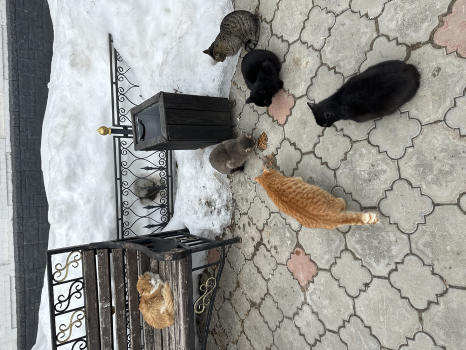 The image displays an outdoor winter scene in Местечко Раифа, Russia. The foreground features a pavement composed of gray, tan, and reddish interlocking concrete pavers. Six domestic cats are present. An orange cat is curled up, resting on a dark-stained wooden bench with black wrought iron arms and gold-colored scrollwork accents. Adjacent to the bench and paved area, a substantial accumulation of snow lines the background, bordered by a black wrought iron fence with a golden finial atop one post. Behind the fence and snow, a building wall with a white upper section and a dark, possibly stone or brick, lower section is visible. Standing on the pavers are five additional cats. A gray tabby cat and an orange cat are actively eating from a visible pile of wet food. A black cat is simultaneously eating from a separate pile of wet food nearby. Another black cat is seated, facing away from the food towards the lower right of the frame. A second gray tabby cat is seated near a dark wooden trash receptacle, facing away from the viewer.