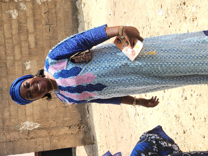 An adult female stands outdoors in Suleja, Nigeria, smiling directly at the viewer
