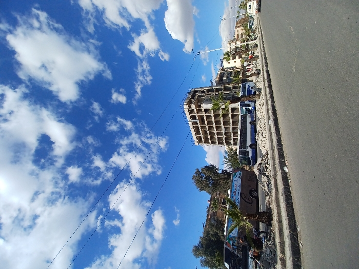 The image captures an urban street scene within Al-Qadam Municipality, Syria, under a bright blue sky dotted with scattered cumulus clouds