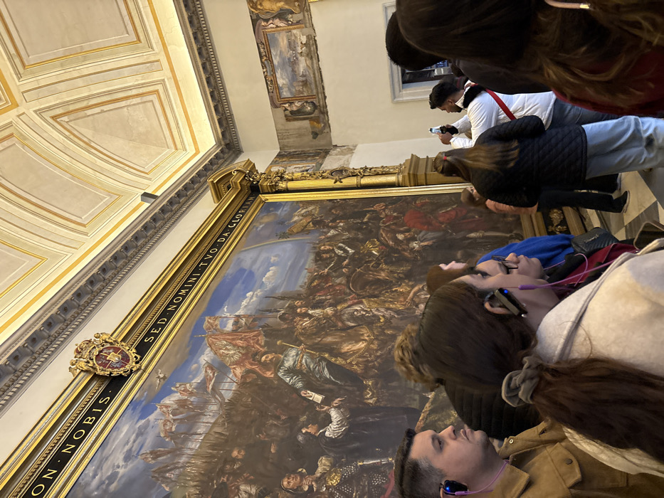 An interior view within the Sala di Costantino (Hall of Constantine) of the Vatican Museums in Città del Vaticano, Vatican City, displays a large group of individuals observing a monumental historical painting