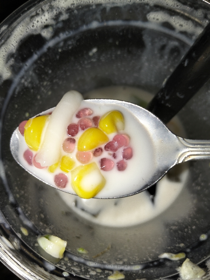 A spoonful of Buko Pandan is held over a glass. The spoon contains yellow corn kernels, small pink tapioca pearls, and strips of chewy white gelatin, all mixed in a creamy white liquid. The glass below has remnants of the same dessert, with traces of coconut and dark gelatin cubes visible in the remaining milky liquid. A black straw is partially visible in the glass.