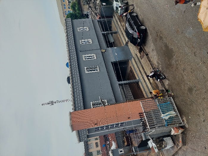 A gray two-story building with white-framed windows sits beside a street. A black SUV is parked nearby. A smaller building with a rusty-brown roof stands adjacent, equipped with a satellite dish. People gather on the street around what appears to be a motorcycle. An antenna is visible to the side of the building.