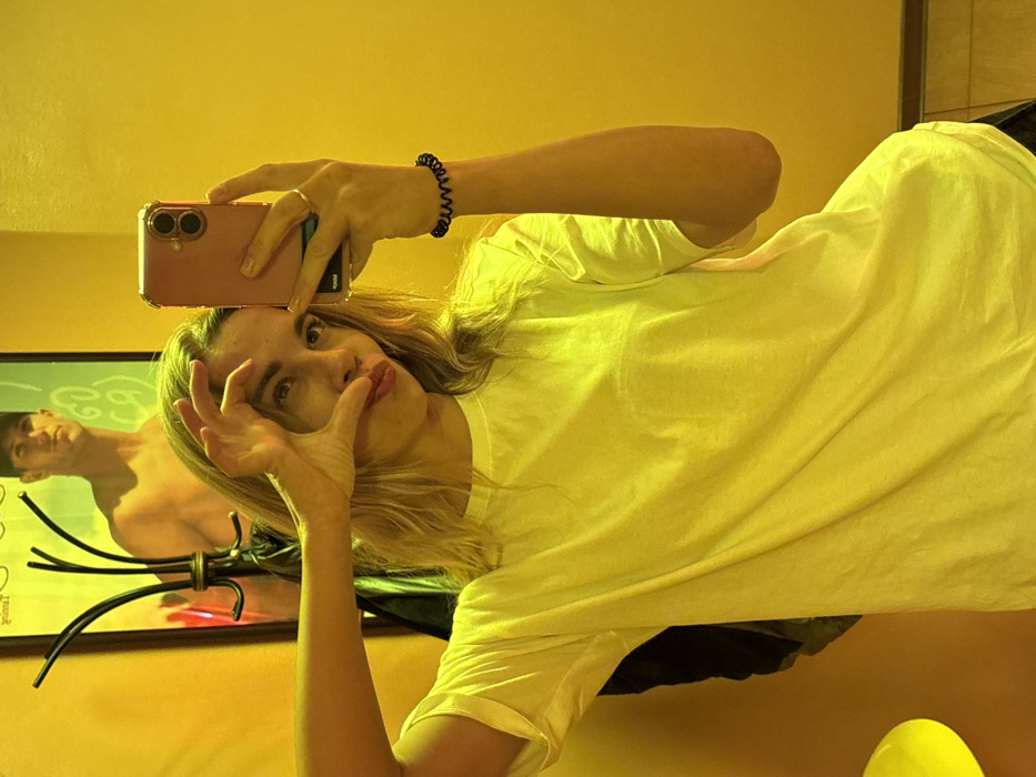 This image captures a selfie taken by a female in an indoor setting, reported to be in Ust-Ilimsk, Russia. The environment is uniformly illuminated with a strong yellow light or features yellow-painted walls. The subject is a young woman with blonde hair, seen from the torso up, wearing a plain white crew-neck t-shirt. She is holding an amber or rose-gold colored smartphone, encased in a clear protective cover, with her right hand, actively taking the photograph. A black spiral hair tie is present on her left wrist, and a ring is visible on her right ring finger. Her left hand is raised near her face, with fingers configured to form a partial shape, while her lips are pursed and she gazes directly into the camera lens. Reflected in the background behind her, a dark, multi-hooked coat rack is visible. To the left of the coat rack, a large poster or advertisement depicts the shirtless upper torso of a male wearing a baseball cap, with the partial number "60" visible next to him. A small, rounded, light-colored object, possibly a stool, is situated in the lower-left foreground of the reflection. The floor appears consistent with the yellow color scheme, featuring a dark skirting board at the wall's base.