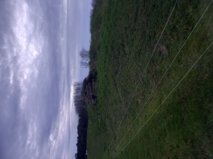 A landscape photograph shows a grassy hillside meeting a cloudy sky. Three power lines stretch diagonally across the green slope. Above, a group of trees and exposed rocks cluster near the hill's crest. A dark line of vegetation is on the left, before the sky. The clouds fill the majority of the sky.