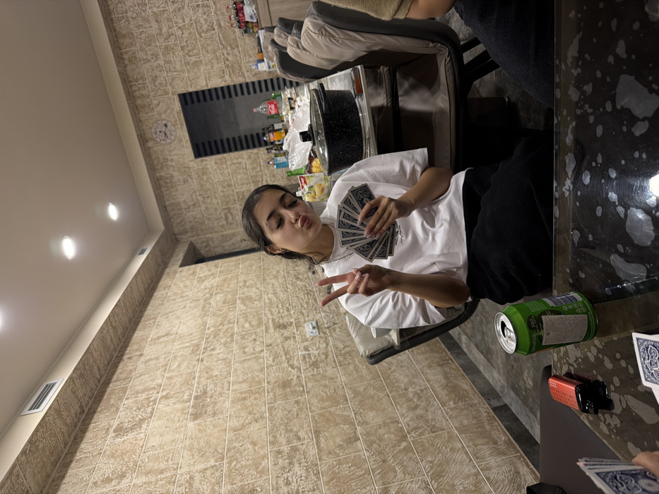A young woman holds playing cards, making a peace sign with her right hand, puckering her lips in a kiss face. She's wearing a white t-shirt and dark pants, sitting at a table with an open green can, a vape, and more cards nearby. The room features beige tiled walls, recessed lighting, and a decorative mirror. Other people are partially visible at the table.