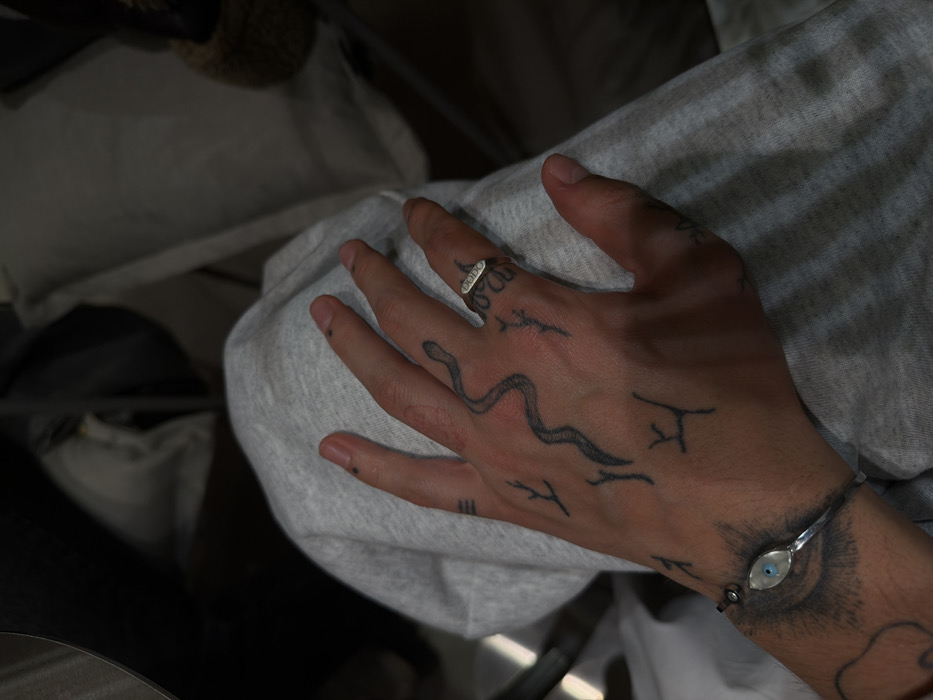 A person's hand rests on a light grey fabric. The hand has several tattoos, including a snake on the back, geometric designs, and an eye-shaped tattoo on the wrist holding a silver bracelet with an eye-like charm. A silver ring adorns the ring finger. The fabric is draped over something, and glimpses of other objects are visible in the blurred background.