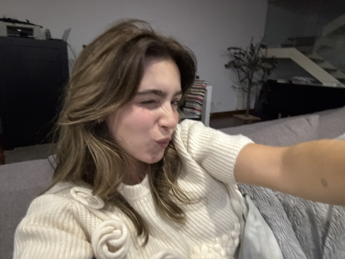 A young woman with long, light brown hair winks and puckers her lips in a selfie. She wears a cream-colored sweater with decorative floral details. The background includes a dark cabinet, a small tree-like plant, and a staircase. The photo is taken indoors, likely on a couch or sofa, suggested by the grey fabric. The lighting is soft, and the overall composition is casual.
