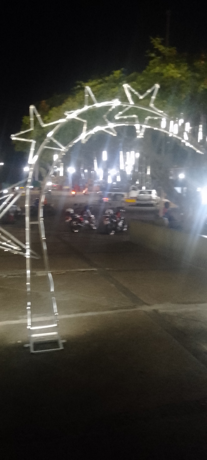 This image depicts a night scene in La Fría, Venezuela, characterized by significant motion blur. A large, white, illuminated decorative archway, composed of multiple star-shaped segments, dominates the left and upper-middle foreground. The archway's support structure is visible on the far left. The ground in the immediate foreground and midground is a dark, paved surface, indicative of a street or plaza. In the midground, several blurred vehicles are present, including at least four motorcycles and, further to the right, a white truck and a white car. Numerous bright, vertical artificial light sources, appearing as streaks and flares due to the blur, illuminate the background and midground. A single, blurred human figure is faintly visible near the white truck on the right side of the frame, appearing to be seated or crouched. The background consists of a dark sky and blurred green foliage from trees, partially illuminated by the artificial lights.