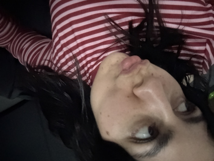 A person with long, dark hair is shown from a low angle, wearing a red and white striped long-sleeve shirt. Their face is angled upwards, showcasing freckles and a slight pout. The person's gaze is directed to the side, away from the camera. The background consists of a dark gray or black surface. The image is slightly rotated, with the person lying down.