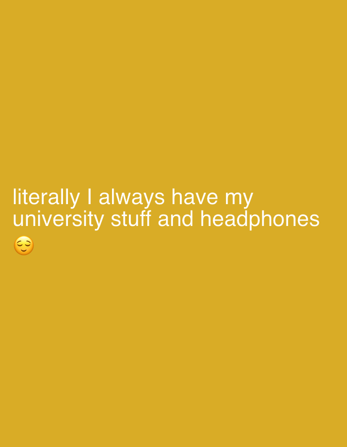 The scene, contextually situated in Burjassot, Spain, displays a solid mustard yellow background. White sans-serif text is positioned in the lower-left quadrant, reading: "literally I always have my university stuff and headphones". Directly below the initial portion of this text, a yellow emoji depicting a contented face with closed eyes is present. No discernible people, specific objects beyond the text and emoji, or direct actions and interactions are visually depicted. The environment is abstract, represented solely by the uniform color field.