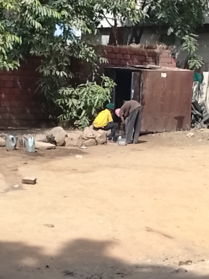 The image captures an outdoor daytime scene in Jos, Nigeria, featuring a dry, reddish-brown dirt ground. Two individuals are positioned in the middle ground. One person is seated on a low, irregular formation of rocks or stone, dressed in a yellow shirt and a dark green head covering, observing the activity below. To their right, a second individual stands, bent forward at the waist, wearing a dark brown top, dark trousers, and a light pink head covering. This person is actively engaged with a white rectangular container situated on the ground. Near the seated individual, on the ground adjacent to the rock formation, are three cylindrical containers; two appear metallic silver, and one is lighter in color. In the background, a structure with a reddish-brown brick wall is visible, featuring an open, dark doorway. Immediately to the right of the doorway stands a rusty brown corrugated metal structure, possibly a shed or shack. Overhead, a large tree with green foliage is prominent in the upper left, with a smaller green bush situated in front of the brick wall. A small, light-colored rectangular brick lies on the dirt ground in the immediate foreground.