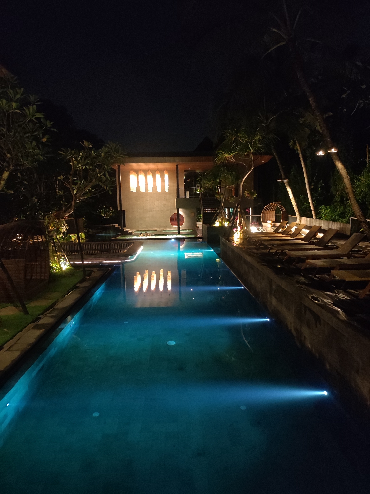 This image depicts a nighttime scene at a resort property in Mas, Indonesia. The central feature is a long, rectangular swimming pool, illuminated from within by blue underwater lights creating distinct beams. To the left of the main pool, a grassy area features tropical foliage and trees, with a decorative, arched, woven structure. A pathway, marked by ground-level lighting, runs alongside this section of the pool. In the background, a multi-story building with modern and traditional architectural elements is illuminated. Its upper facade displays five vertically oriented, rectangular panels or windows glowing with warm light, which reflect distinctly in the pool's surface. Below this building, two individuals are partially visible in a connected, shallower pool or hot tub area. To the right of the main pool, a raised wooden deck is visible, furnished with approximately twelve unoccupied light-colored lounge chairs arranged in a row. Several tall palm trees line this deck, some illuminated by upward-facing lights mounted on their trunks. Another decorative, woven circular chair or daybed is present on the deck further from the foreground. The overall environment is lush with tropical vegetation, silhouetted against the dark night sky.