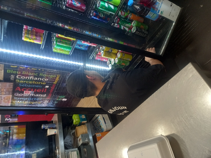 A person wearing a black shirt and a cap is seen standing in front of a refrigerated display case filled with various canned and bottled beverages. The display case also features illuminated signs in French and other languages. In the foreground, a stainless steel countertop is visible, with a white container on it. The environment suggests a retail or convenience store setting.