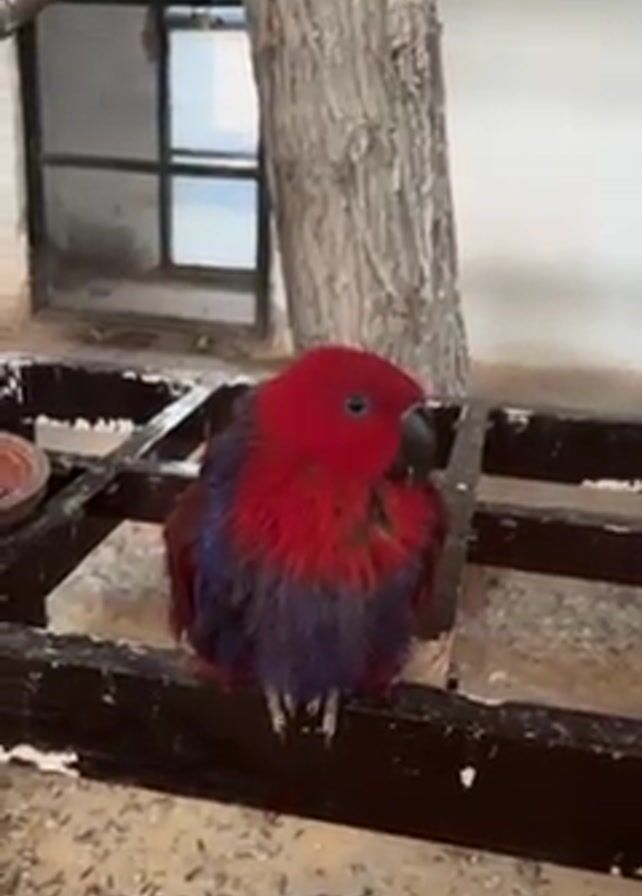 female Eclectus parrot sitting on a black metal frame near a tree trunk. The parrot has red and blue feathers, and the feathers look wet or damp. The camera pans up to show the interior of what appears to be a bird aviary. Other birds are visible perched on branches and structures within the aviary.