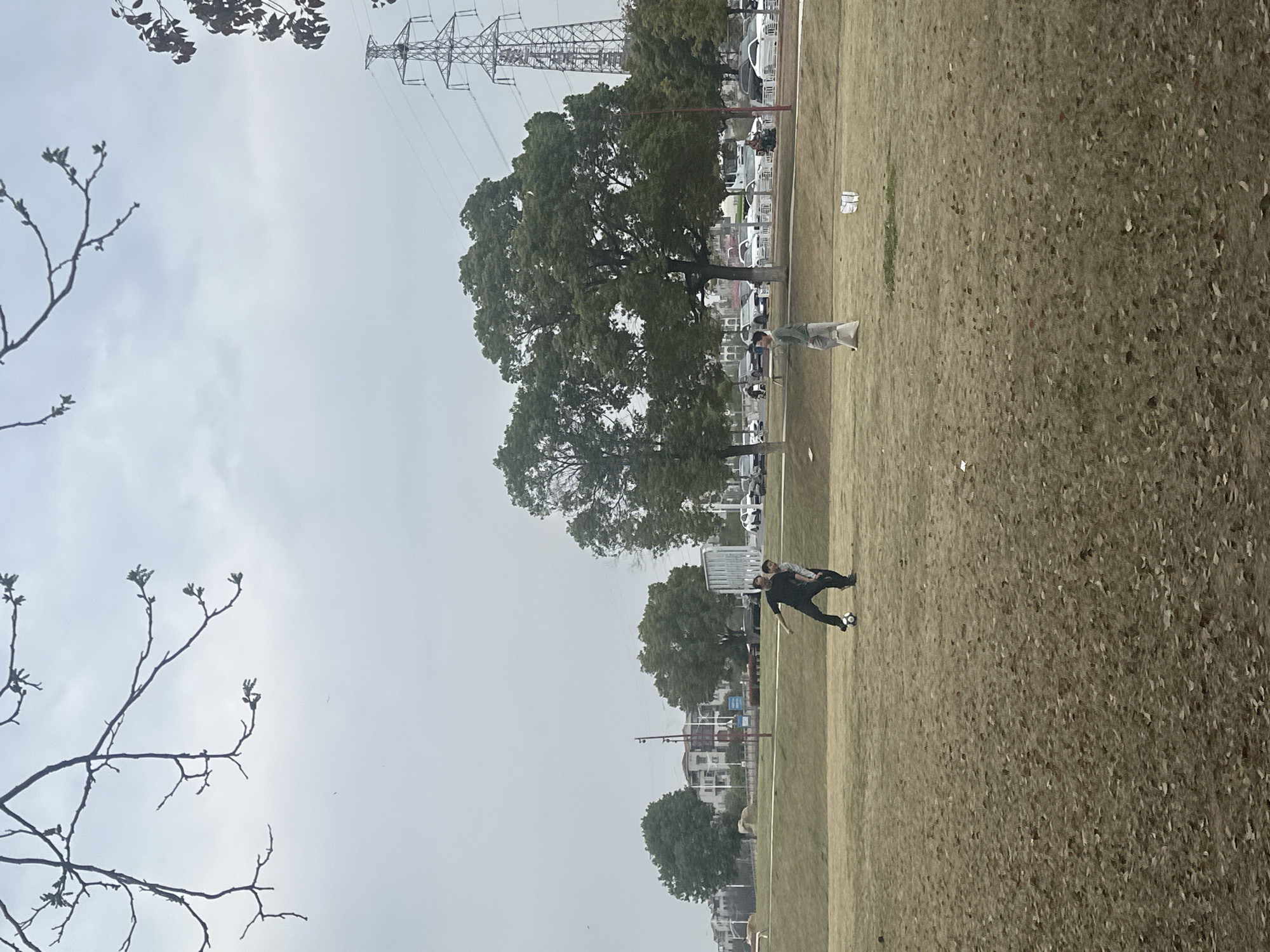The scene depicts an outdoor public green space in Jiangning District, China, under an overcast sky. The foreground features a large expanse of dry, yellowish-brown grass intermixed with fallen leaves. Three individuals are visible on this grassy area. In the left midground, an adult male in dark clothing is actively dribbling or kicking a black and white soccer ball with his right foot, while a child in lighter attire stands close by, observing the ball. Further to the right, another male, dressed in a light green top and light grey pants, walks across the field, carrying a white bag in his left hand. The background reveals a paved road with numerous parked vehicles, predominantly light-colored cars, and some moving vehicles including a white van and a scooter. Beyond the road, multi-story residential buildings are partially obscured by a line of trees, including both large evergreen and deciduous varieties with some new spring growth. A tall, metal lattice-work electricity pylon with associated power lines stands prominently on the far right. Bare tree branches with visible budding are silhouetted against the cloudy sky in the upper frame. Several small white objects, possibly debris, are scattered across the grass, and a larger white object, potentially a marker, is on the ground in the mid-right.