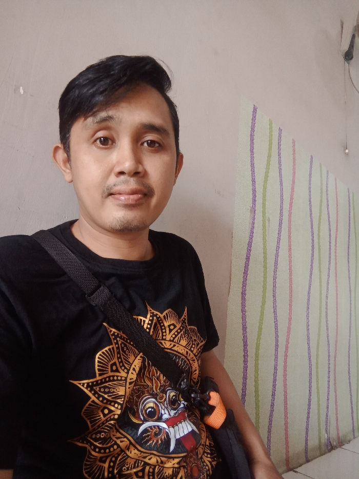 A man with black hair, fair skin, and a faint mustache poses indoors. He wears a black T-shirt with a large, golden graphic design and a black strap across his chest. Behind him are walls, one solid light gray and the other with vertical stripes in shades of green, purple, and pink. A small, electrical fitting is visible high in the background. The man's expression is neutral, and he looks directly at the camera.