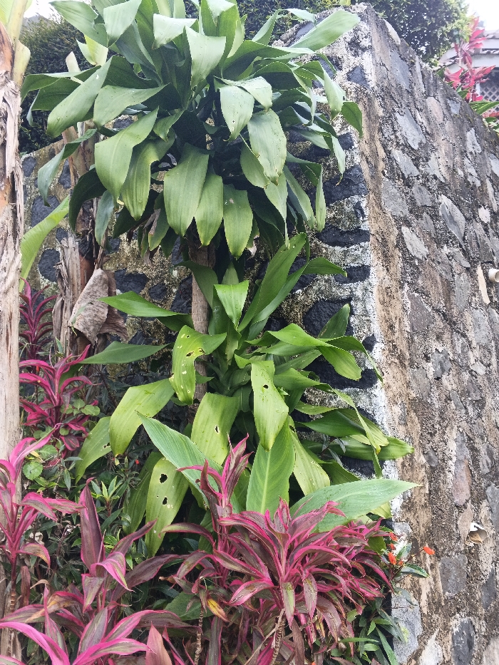 The image displays a vertical shot of tropical foliage growing against a stone wall in the city of Unknown, Cambodia