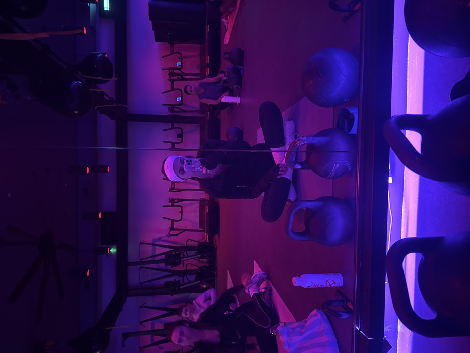 A gym scene with a mirrored wall shows a woman taking a selfie, wearing black leggings and a white headband. The mirror reflects gym equipment, including kettlebells, a stability ball, and weight racks. Another person sits on a machine in the background. The room is lit with purple and blue hues, creating a vibrant atmosphere. A water bottle sits on the floor beside a striped bag.