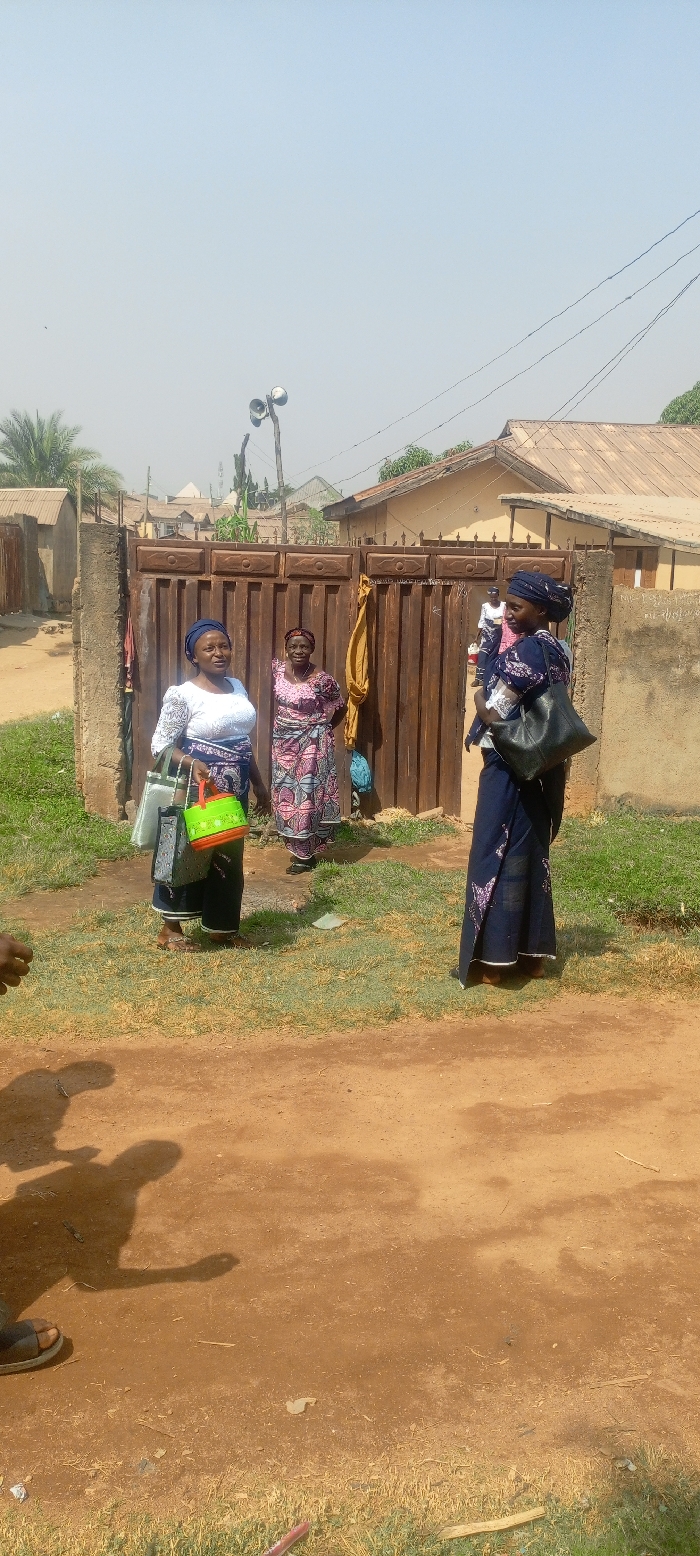 The image depicts an outdoor daytime scene in Ungwan Liman, Nigeria, featuring three adult females and a partially visible fourth individual