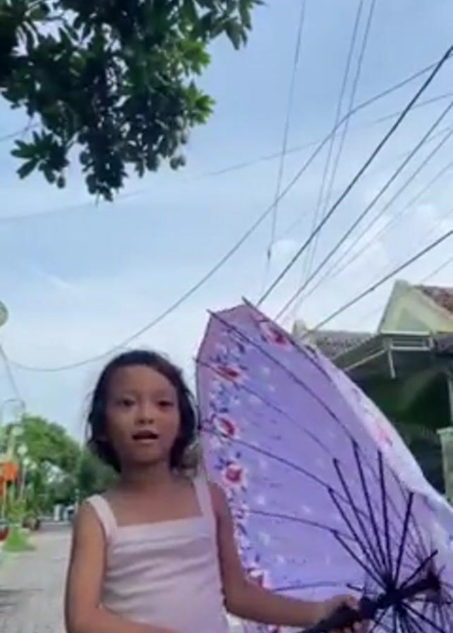 A young girl stands on a residential street, holding open a large purple umbrella with a floral pattern. The sky is partly cloudy. Electrical wires run overhead. The girl is wearing a light-colored tank top and patterned shorts. She initially appears surprised, then smiles and holds the umbrella high above her. The background features a tree, houses, and a paved street.