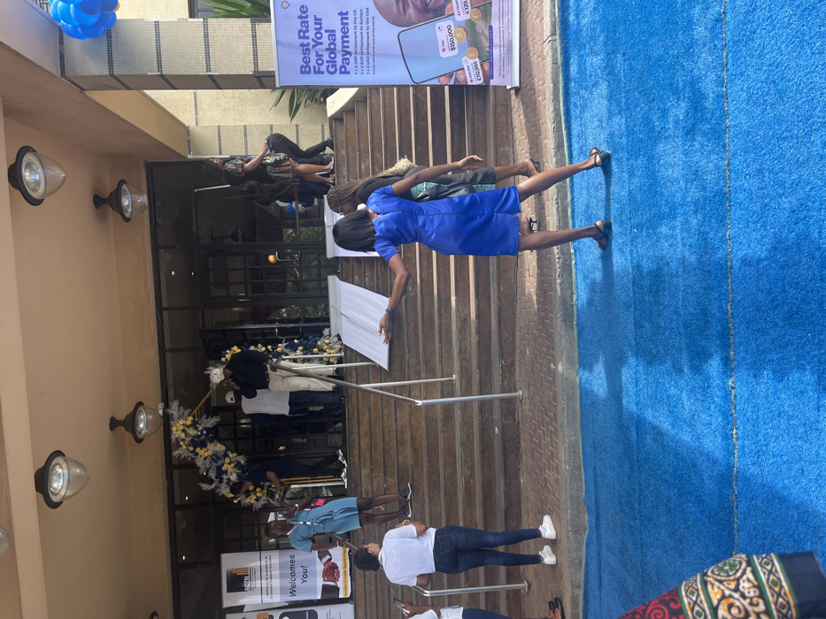 The image depicts an outdoor entrance area of a building, identified as likely the Eko Hotels & Suites in Victoria Island, Lagos, Nigeria, given the architectural style and the presence of a banner for the "Association of Corporate Treasurers of Nigeria" (ACTN), an organization known to hold events there. The scene features a wide, multi-tiered brown-tiled staircase leading up to a set of dark glass double doors, above which is a decorative archway adorned with blue and white/yellow floral arrangements. Four dome-shaped exterior light fixtures are mounted on the light brown building facade above the entrance. The ground level in front of the stairs is covered with a bright blue carpet. Approximately twelve individuals are visible. In the immediate foreground, on the blue carpet, a woman in a royal blue knee-length dress stands with her back to the camera, her arms slightly outstretched. Another woman in a dark patterned dress is partially visible behind her, to the right. On the far left, a person wearing a patterned garment is partially visible. On the staircase, a woman in a light blue dress with an ID badge stands on a lower step, looking towards the viewer. Another woman in a white t-shirt and dark jeans is visible on a lower step to the left, looking down at a phone. Two temporary white panels, possibly ramps or coverings, are placed over a section of the stairs leading towards the entrance. Near the entrance archway, several men are gathered, including one in a black shirt and white cap and another in a white shirt and white cap. Two tall banners flank the stairs: On the left, a partially visible white banner displays the "ACTN" logo and "Association of Corporate Treasurers of Nigeria Welcomes You!". On the right, a purple-blue banner advertises "Best Rate For Your Global Payment," detailing GBP, EUR, and USD settlement options and displaying a smartphone interface with currency amounts, along with a partial image of a smiling man. Blue balloons are partially visible on the far right, just beyond the right banner. The scene is brightly lit by daylight, indicating an outdoor event setting.