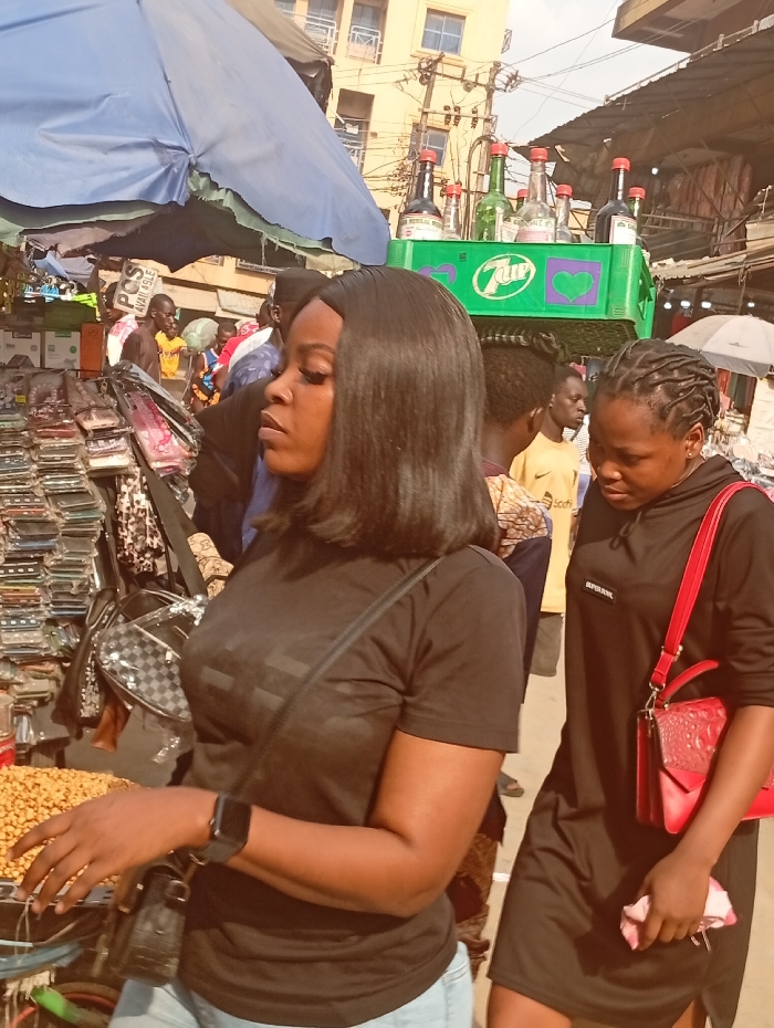 The image depicts a bustling outdoor market scene in Fegge, Nigeria, under bright daylight. In the foreground, a woman with dark, straight, shoulder-length hair wears a black short-sleeved t-shirt, light blue jeans, and a black cross-body bag. A dark smartwatch is visible on her left wrist, and her right hand rests near a container of light-colored, granular food, likely groundnuts, on a market stall. To her right, a second woman with dark braided hair wears a long black dress featuring a "SUPERBNE" label on the chest. She carries a bright red, crocodile-textured handbag on her left shoulder and holds a light-colored cloth and keys in her right hand, looking downwards. Behind these two individuals, a green 7UP crate is visible, displaying an assortment of glass bottles, some clear and some containing dark liquid, all topped with red caps. Further in the background, a blue market umbrella provides shade over a stall displaying numerous stacked phone cases or accessories. Several other individuals are present in the blurred background, including a man wearing a yellow t-shirt and another partially obscured by a white sign that reads "POS AVAILABLE." The uppermost background reveals multi-story buildings, utility poles, and overhead power lines, consistent with an urban market environment.