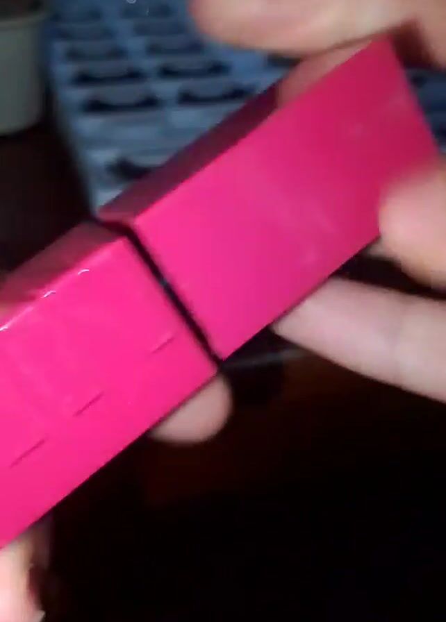 A pair of hands is shown opening a pink tube of lip gloss. Once the gloss is opened, the applicator is removed, revealing the pink gloss inside. The hands then close the tube of gloss. A blurry eyelash case sits on the table behind the gloss.