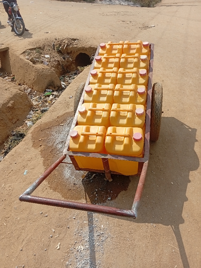 - "A two-wheeled, dark brown metal cart, loaded with twelve yellow plastic jerrycans, stands stationary on a dry, sandy-brown dirt surface in Lugbe, Nigeria" by FM-gztIu1, licensed under CC BY 4.0