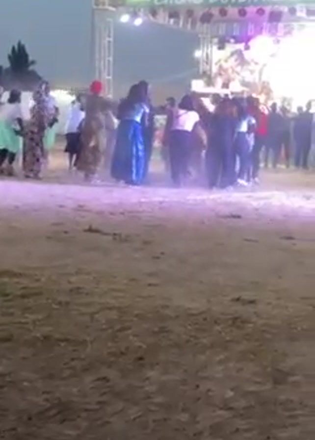 The scene shows an outdoor gathering at dusk or dawn. A small crowd of people is loosely gathered in front of a stage structure, marked by lighting and a banner that reads "CHONG DOVETAIL." The ground appears to be sandy or dusty, and the camera is positioned at ground level, providing a slightly obscured view. A few people in the crowd are dancing in the center, kicking up dust. Most of the individuals are dressed in casual attire, with some women wearing long dresses. The overall atmosphere seems to be celebratory or festive.