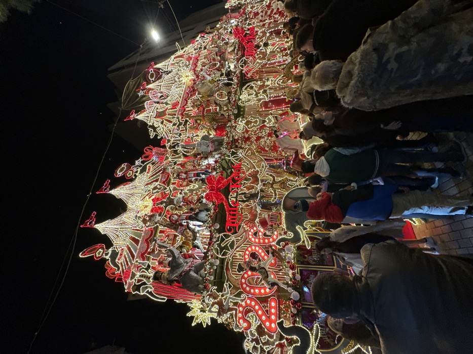 A nighttime shot depicts an elaborately decorated building facade adorned with festive lights and figures