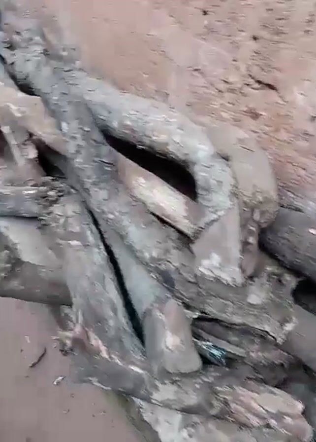 pile of branches on a concrete platform next to a building. The building is made of bricks and mortar. The ground is dirt, and there are some plants in the background, including banana trees. There is also a bench in the distance. The video is shot from a stationary position.