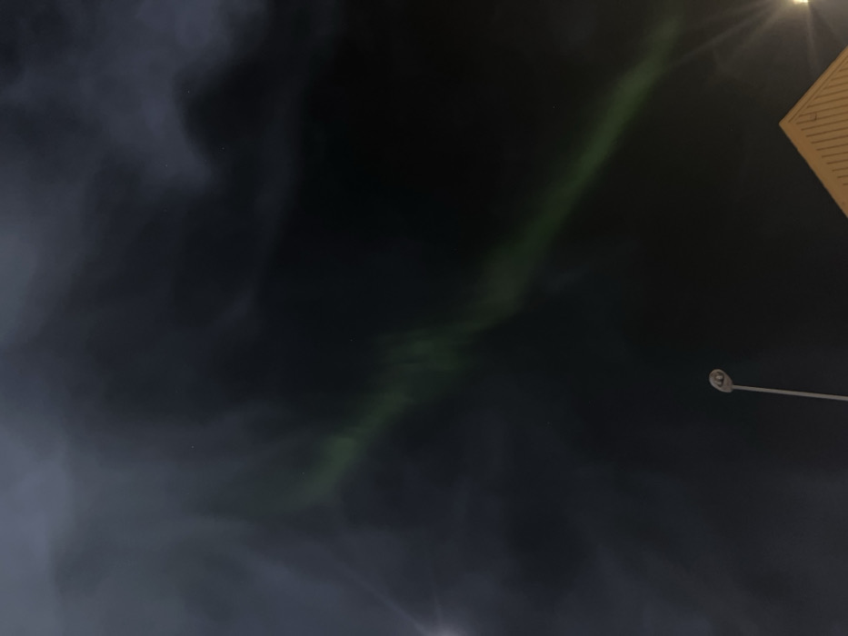 The image displays a nighttime scene in Tromsø, Norway. A prominent green band of aurora borealis stretches diagonally across the dark sky, from the upper left quadrant towards the lower right. Wispy, dark gray atmospheric haze or thin clouds are distributed across the sky, particularly on the left, partially obscuring the aurora and a diffuse bright light source on the far left. In the lower-left foreground, a single, light-gray street lamp pole with a rounded luminaire extends upwards. The top portion of a building with a light-brown or yellowish pitched roof is visible in the lower-right corner, illuminated by a strong, off-camera light source creating lens flare on the right edge. No individuals or discernable actions are present.