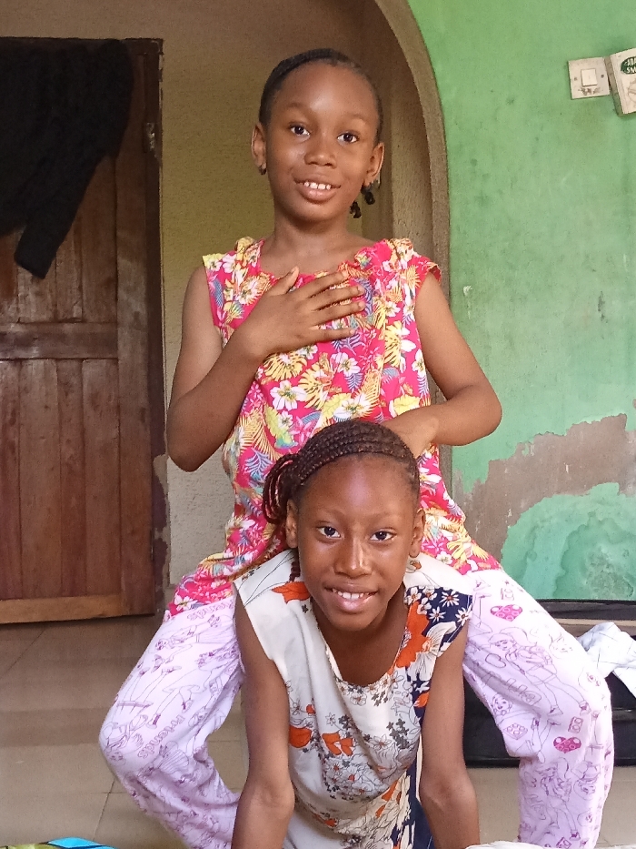 This image depicts two young females, likely children, posing playfully in what appears to be a domestic interior in Zango-ndaji, Nigeria
