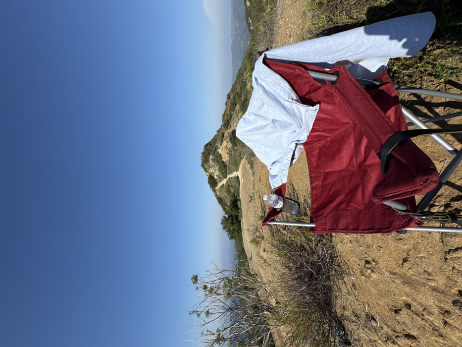 A red folding camping chair is positioned on a dry, dirt hillside in the Unincorporated Santa Monica Mountains, United States of America