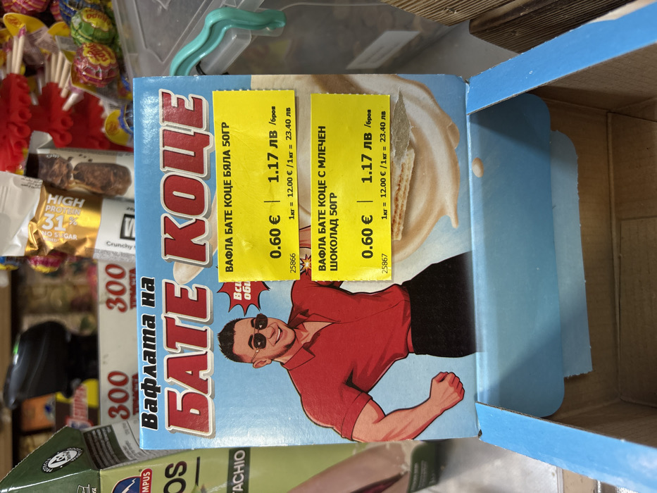 The scene depicts an interior view of a retail establishment, likely a supermarket or convenience store, located in Varna, Bulgaria. The primary subject is a cardboard point-of-sale display for "Bate Kotse's Wafer" (Вафлата на БАТЕ КОЦЕ). The display features a cartoon illustration of a muscular, light-skinned male figure with short dark hair, wearing sunglasses, a red short-sleeved collared shirt, and dark trousers. He is smiling, with his left arm bent and hand clenched. Below the main text and illustration, two yellow price labels are affixed. The top label indicates "Bate Kotse White Wafer 50g" (ВАФЛА БАТЕ КОЦЕ БЯЛА 50ГР), priced at 0.60 EUR or 1.17 BGN per piece, with a unit price of 12.00 EUR/kg or 23.40 BGN/kg (product code 25866). The bottom label indicates "Bate Kotse Wafer with Milk Chocolate 50g" (ВАФЛА БАТЕ КОЦЕ С МЛЕЧЕН ШОКОЛАД 50ГР), also priced at 0.60 EUR or 1.17 BGN per piece, with the same unit price (product code 25867). Below these labels, a light-colored wafer and a splash of a milky substance are depicted on the display. The display box itself is partially empty, revealing its light blue interior base and cardboard structure. In the background to the left of the display, a green and white package, partially labeled "CAMPUS PISTACHIO," is visible. To the right and behind the display, various retail products are arranged on shelves. These include a black barcode scanner, red signs with the number "300" printed on them, a golden-colored "HIGH PROTEIN" bar (labeled "31% protein" and "NO SUGAR"), and several clear containers filled with colorful candies, including Chupa Chups lollipops. A transparent plastic bin with a green handle is partially visible on the far right. The lighting suggests indoor artificial illumination. The specific address within Varna cannot be determined from the image.
