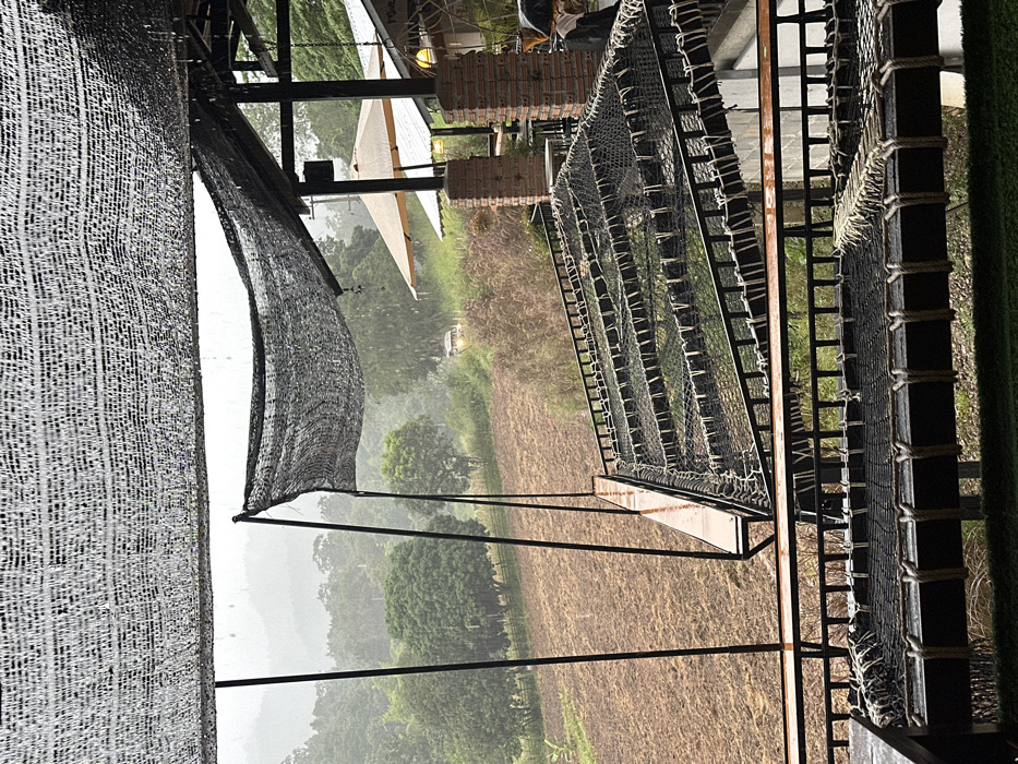 The image depicts an elevated outdoor viewing or lounging area in Ban Paem Bok, Thailand, during a rain shower. Overhead, a black mesh shade net is visible, with raindrops evident. The foreground features two horizontal platforms constructed with black metal frames and tightly woven black netting, possibly for hammocks or seating, edged with light-colored rope. These platforms appear wet. Below these structures, a dirt or tilled field extends into the midground, beyond which a dense, green forest line is visible. Rain streaks are evident throughout the midground. To the right, a portion of a building with brick pillars and a sloped roof is visible, along with a large, beige patio umbrella. A white vehicle is partially obscured by trees and rain in the distance, on what appears to be a track or road. The background consists of hazy, verdant mountains under an overcast sky. No individuals are present in the scene.
