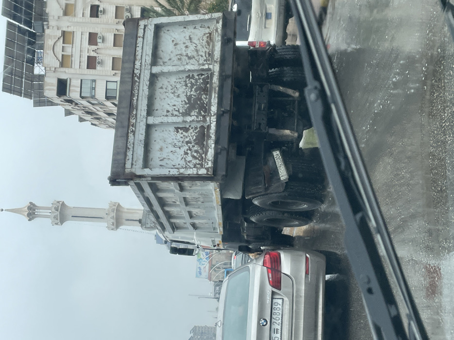 A vertically oriented image captures a rainy street scene. A dump truck occupies much of the frame, positioned in front of a silver BMW with license plate "ΞS 26889." In the background, a mosque minaret and a multi-story building with solar panels are visible. The windshield wipers of the vehicle taking the photo are prominently displayed due to the rain.