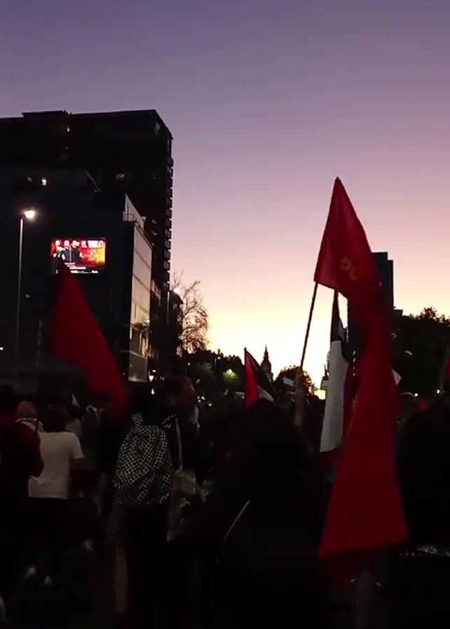 A crowd of people is marching down a city street at dusk. The sky is a gradient of purple and orange. Many are carrying red flags. A building to the left has a large screen displaying an image. Streetlights are visible. The mood seems energetic.