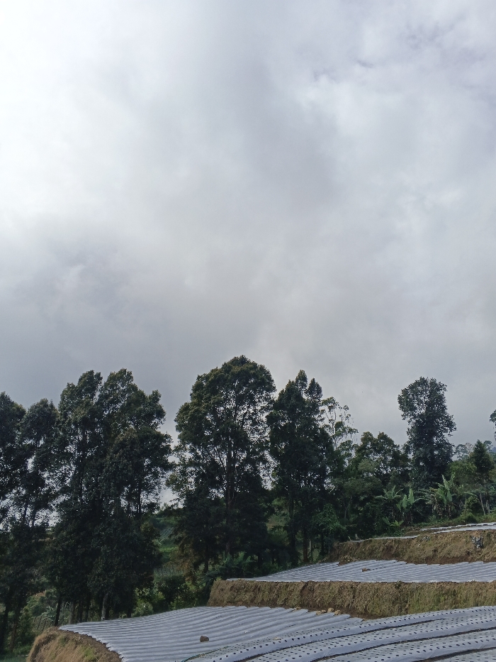 Overcast skies dominate the scene, casting a diffused light on the landscape below. A row of dark green trees stands as a natural barrier, contrasting with the light gray sky. Below the trees, agricultural terraces covered in white plastic sheeting create a pattern of parallel lines. The ground between the terraces is brown and earthy, suggesting recent cultivation. Overall, the image presents a serene rural setting under a cloudy sky.