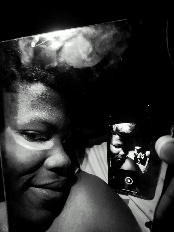 A black and white selfie captures a person holding a mirror and a phone. The mirror reflects half of their face, while the phone's screen displays a smaller, similar image. The person appears to be smiling slightly, with a distinct white mark on their temple. The background is dark, making the reflections and the phone's screen the primary sources of light. A finger holding the phone is visible.