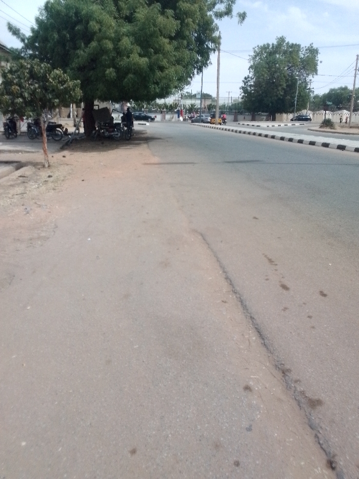 The image displays a street scene in the city of Muhammadu Dikko Stadium, Nigeria