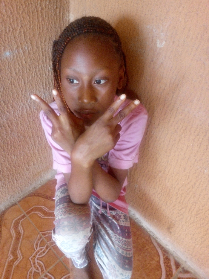 A young individual is depicted in a medium shot, positioned in a corner of a room in Zango-ndaji, Nigeria. The subject, appearing to be a child or adolescent with dark skin and dark braided hair, wears a light pink short-sleeved t-shirt and light-colored patterned trousers or a skirt. Both hands are raised, crossed at the wrists in front of the chest, with each hand displaying a "peace sign" gesture (index and middle fingers extended, others folded). The fingertips exhibit light-colored nail polish. The subject's gaze is directed towards the left side of the frame, with a neutral facial expression. The background consists of two textured, light brown/orange walls meeting at a corner. The floor is covered with light brown/orange tiles featuring darker geometric patterns.