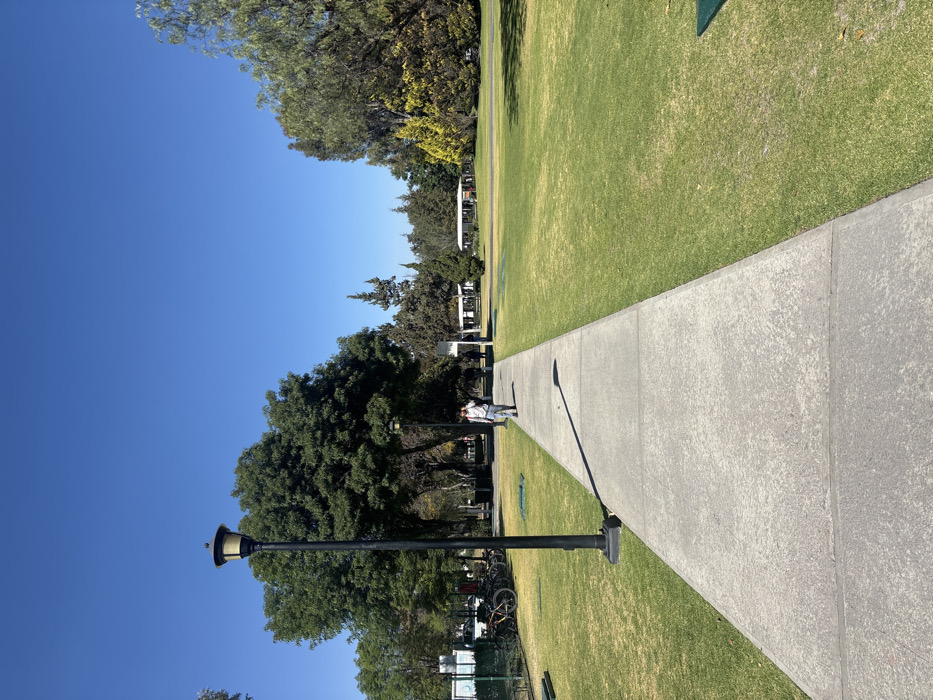 A long gray sidewalk cuts diagonally across the frame, separating green grass on either side. A person walks along the sidewalk, casting a shadow. A black lamppost stands tall on the left side of the path. Lush trees frame the clear blue sky above. Bicycles are parked near the lamppost and the lawn stretches to the edges of the image.