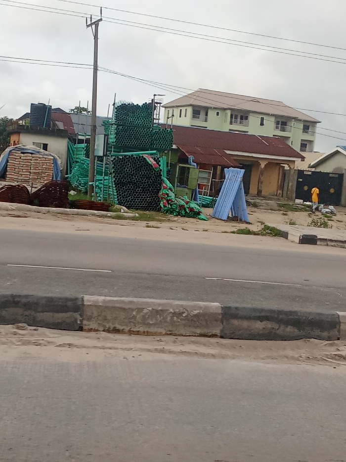 The scene depicts an urban roadside environment in Unknown, Unknown, under an overcast sky. In the foreground, a two-lane asphalt road, marked with a broken white centerline, is bordered by a concrete curb, painted intermittently grey and black, separating it from a dirt and sandy shoulder with sparse growth. On the left side of the shoulder, a stack of light-colored bags, covered by a blue tarp, is positioned adjacent to coiled bundles of rebar. Behind these, a single-story building with a dark roof supports a black cylindrical water tank. Centrally, a utility pole with overhead power lines stands next to a tall, unstable stack of numerous green pipes, likely PVC, with additional green bundled materials on the ground. To the right, a small, single-story building with a reddish-brown corrugated metal roof and faded yellow walls features an open window. A blue corrugated metal sheet is propped on the ground in an A-frame configuration. Further right, a lone individual, wearing an orange shirt and dark pants, is observed attending to several white bags near a black metal gate and an adjacent building. In the background, a multi-story building with light green walls and a light brown hip roof is visible, featuring multiple windows and balconies.