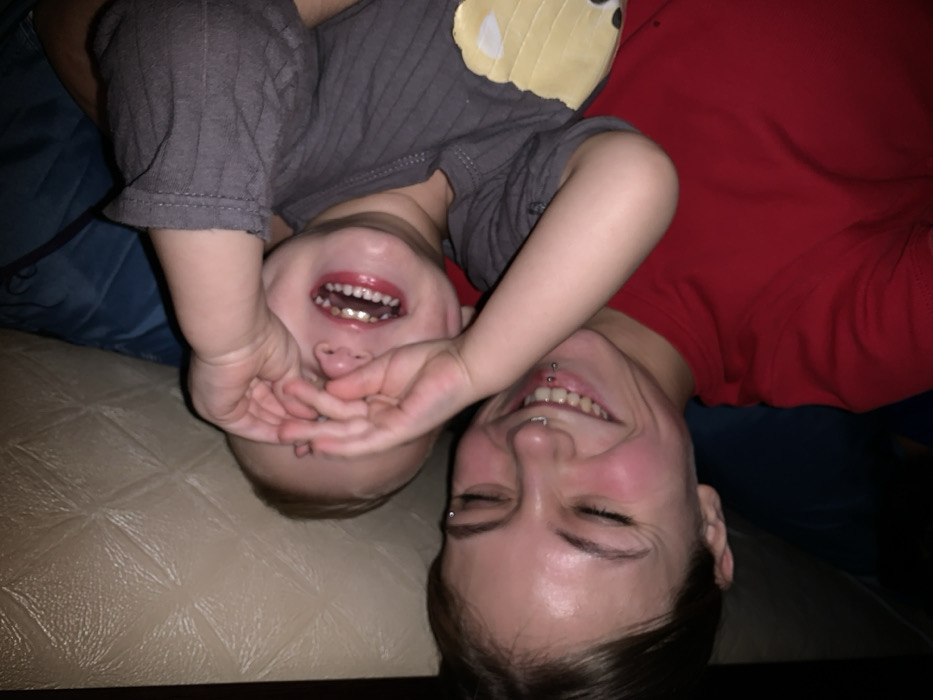 A woman and a young child lie upside down together, smiling widely. The child, clad in a gray patterned shirt, covers their face with their hands, displaying a toothy grin. The woman beside them, in a red shirt, has several visible piercings near their upper lip. Both subjects appear happy and relaxed, creating an intimate and playful moment captured in the photograph.