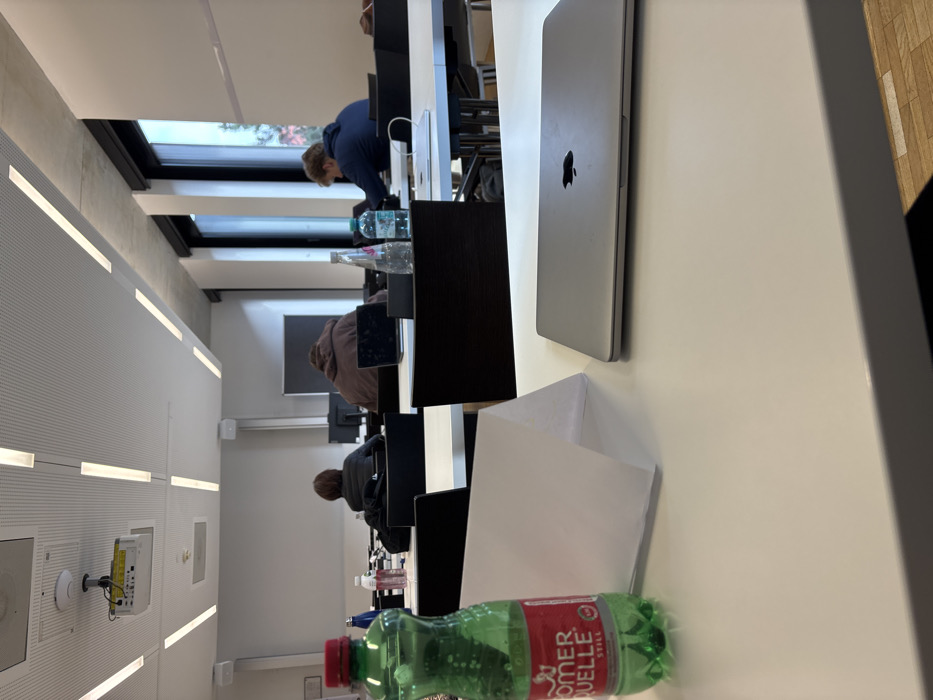 The image displays the interior of a modern classroom or lecture hall situated in Krems an der Donau, Austria. In the foreground, a white rectangular table holds a partially full green plastic bottle of Römerquelle Still water with a red cap and label on the left. Adjacent to it is a folded white piece of paper. To the right, a closed silver Apple MacBook laptop with a visible dark Apple logo rests on the table. In the midground, three individuals are seated at white tables with dark chairs, viewed from behind. The leftmost person wears a dark jacket, facing a dark monitor. The central person wears a brown hooded sweatshirt, positioned before an open laptop and a dark monitor, with a clear glass bottle and a blue plastic bottle on their table. The rightmost person wears a blue hooded sweatshirt, situated near tall windows, and is looking downwards. The background features a white acoustic panel ceiling with multiple linear LED light fixtures and a ceiling-mounted projector in the upper left quadrant. A large white projection screen is visible on the front wall. The right wall contains tall, dark-framed windows that admit natural light, with faint green foliage visible outside. The individuals appear independently engaged in quiet work or study; no direct interactions are observed.