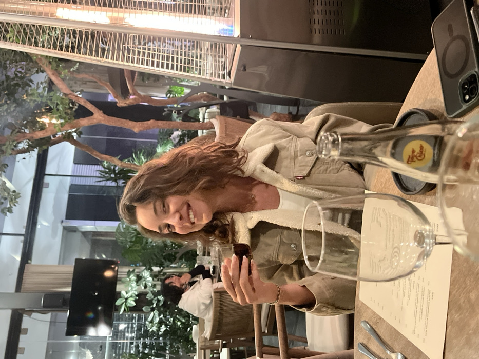 A smiling woman sits at a table in an outdoor restaurant setting. She wears a light brown jacket with a white shirt underneath. A wine glass and bottle of Topo Chico occupy the foreground, partially obscuring a menu. A phone sits to the right. A heat lamp is visible above, along with trees and greenery outside. Another person sits in the background. The restaurant appears to have large windows and modern decor.