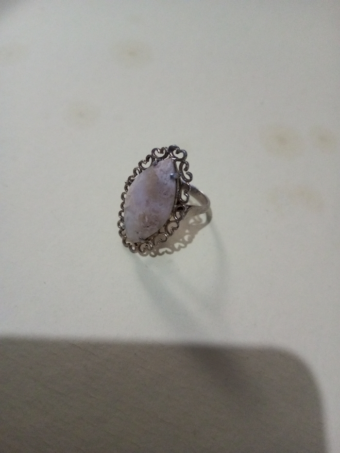 A silver ring with an ornate filigree setting holds a marquise-shaped stone. The stone is light in color, appearing cloudy and possibly speckled with darker inclusions. The setting's design features delicate, curled metalwork. The ring sits on a light-colored surface, casting a distinct shadow.