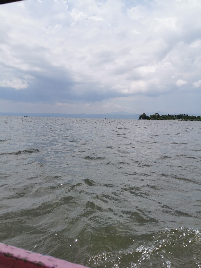 The image depicts a broad expanse of Lake Victoria, viewed from a low angle aboard a moving vessel, likely off the coast of Kisumu, Kenya. The foreground, specifically the bottom left corner, displays a segment of a weathered, pink-painted boat hull with disturbed water showing white froth, indicating forward motion. The middle ground is dominated by the lake's surface, characterized by choppy, dark grey-green water with visible ripples and small waves reflecting a muted sky. Several small, dark, elongated objects, consistent with distant fishing boats or canoes, are faintly visible on the water's surface towards the left and central horizon. The background features a low-lying, tree-covered landmass extending into the lake on the right, dense with green foliage. A light-colored structure is partially discernible among the trees on this landmass. Beyond this, a faint, hazy blue-grey outline of distant hills or mountains stretches across the horizon. The sky, occupying the upper third of the frame, is overcast with a dense layer of white and grey clouds, suggesting diffused daylight. No people are visible.