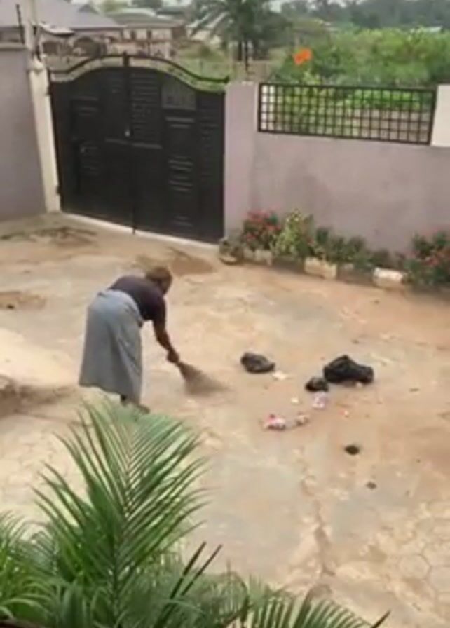 A person is sweeping the courtyard of a building. The person is facing away from the camera, and is wearing a dark shirt and a long, light-colored skirt. They are using a traditional broom made of twigs or branches to sweep litter into a pile. The courtyard is paved with a pattern of square tiles, and there is some trash scattered on it. In the background, there is a dark metal gate, a fence, and some buildings. There are plants along the edge of the courtyard and a palm tree visible. The sky is overcast and appears to be early morning or late afternoon.